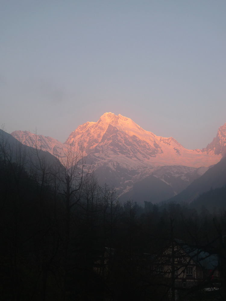 出门的时候回头一看,白皑皑的金山山顶就整个在眼前,没有一丝云雾遮住,美丽地令人窒息。于是等不及了就在酒店门口咔嚓了几张。清晨还是有些困意,不过整个人精神状态还不错,加上清冷的空气就愈发清醒了。