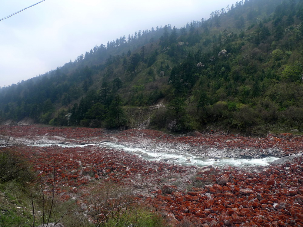 出了海螺沟之后一路上的红石滩,很多很多血红色的石头散落地排布在河川两边,从上往下看甚为美丽。可惜山间云雾缭绕拍出来也只得如此。