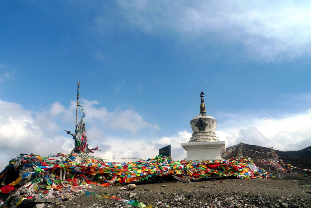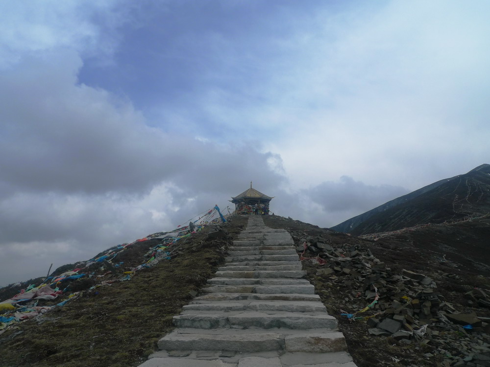 下午经过了折多山哑口,海拔4298米,有随风翻滚的经幡和白色的塔子,以及不少休息的骑友。现在想来,之后一路过了那么多垭口,折多山的海拔不是最高的,也没有白雪覆盖,印象却是最深刻的。可能也是应了一句老话说第一印象,大致也是因为第一次看到那么多经幡,在垭口的狂风乱作下发出撕裂空气的声响,沿着那一级级像是蔓延到天际的石阶一向上,站着歇口气那猛烈的风似乎就恨不得将你推下。开始走的时候还有些阳光,一点一点一个台阶一个台阶爬到最上面的太阳竟又被云遮住。右手边便是那几个“康定情歌”的大字,想要拍照还生怕一个不稳相机给吹跑了。好歹走到了最上层的亭子,像是重病患者的绷带一般裹满了经幡。走之前一位友人嘱托我替她挂经幡,那个时候不禁想风那么大我要怎么挂呢,事后证明这真只是想多了。几个人在垭口顶上咔嚓了不少张又是奇怪POSE的照片。有趣的是,我们下来之后正好有只黑色大鸟在头侧飞过,藏民们纷纷喊拍下来拍下来但这个时候取出相机哪里还来得及。
