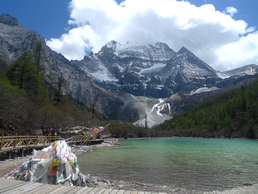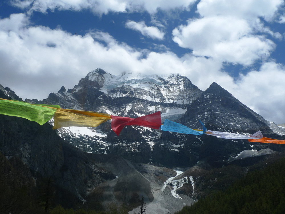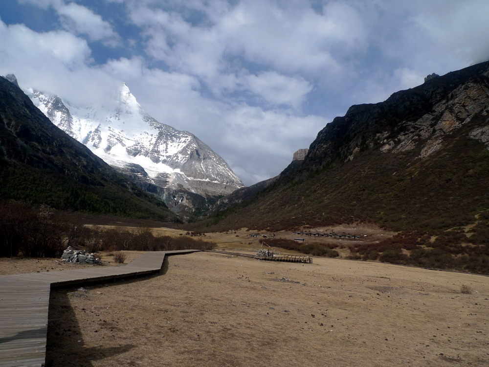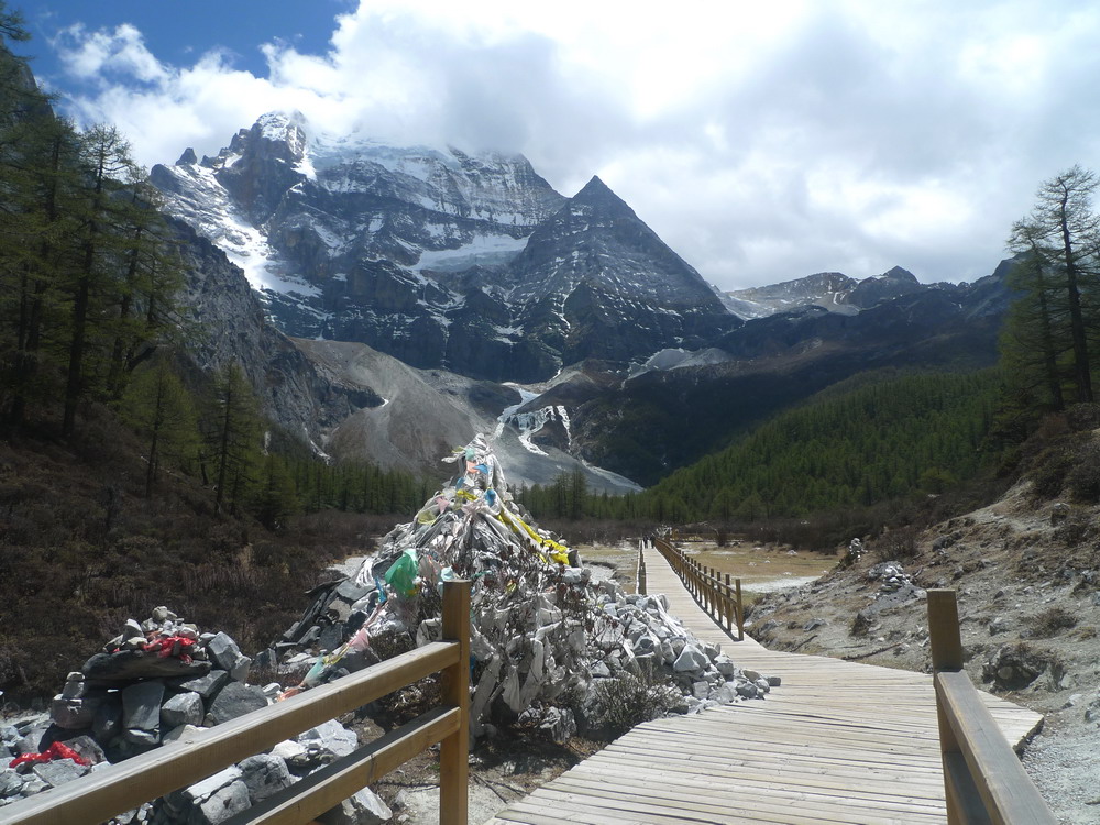 其实在冲古寺便隐约能望见仙乃日的峰顶了,绕过几个大型的玛尼堆,继续上山。现在的路已经修地很好了,途中遇到转山的阿婆,走地很慢但看上去比我们轻松多了。之后遇到的驴友说他还在冲古寺死皮赖脸求里头的喇嘛收留了一晚,那段经历也甚为有趣,有空了再替他写出来。