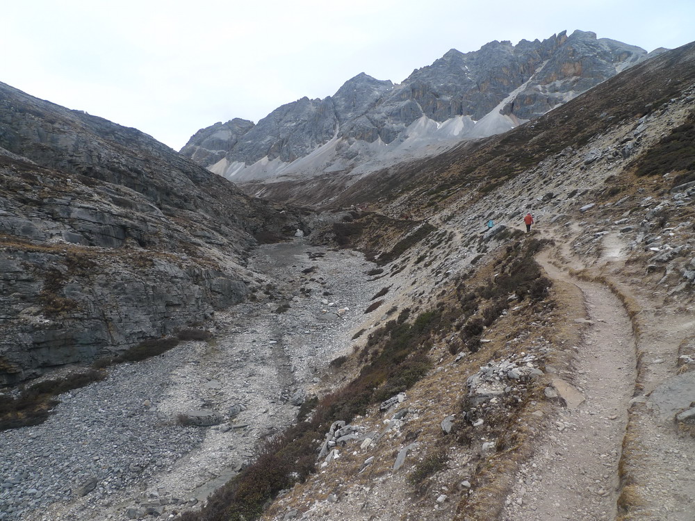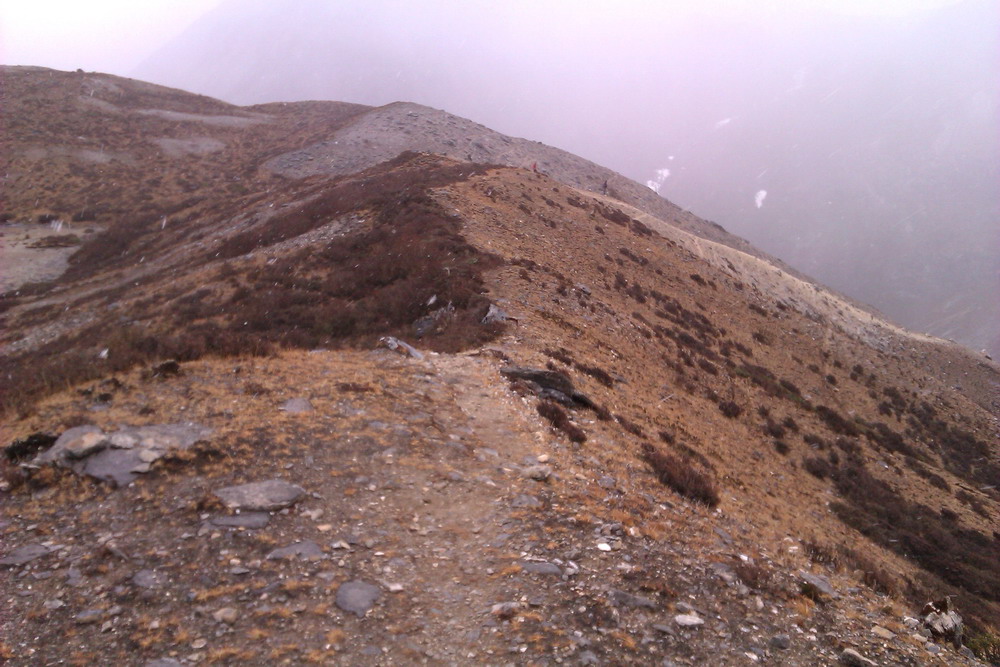 我们其实就是走在细长条的山脊上,此刻真后悔packing的时候没有带上一次性雨披啊!雪越下越大,我也收回照相机塞到背包里,后来回到旅馆发现里头的票子啊纸质攻略啊全都湿透了……笑。有段下坡基本没有路,只有隐约可见的三三两两前人踩出来的足迹,由于下雪石头松动,我一个没踩稳便摔了下去……还好是屁股着地!看着脚下的坡度,觉得站起来也是再摔一跤,于是干脆用屁股滑下去了……然后于一块较为平整的地方再支撑着站起来。好在随身带了邦迪,(以后爬山要戴手套啊!),手上也只是擦伤,比较严重的反倒是昨天从中间断裂开来的大手指甲(在西藏总共断了三次指甲了……)除了地滑,腿部的力气也渐渐流失,看着前方看似很近走走还有一段的塔子经幡垭口标志性的地方,当时说实话有股名叫绝望的情绪油然而生,觉得我大概走不到那里了。然而停在原地也不是个办法,雪是越下越大的,冰雹打在脸上也怪疼的。咬咬牙跟随前方的步伐,一点点下到之前溪流石坡的地方。到了这里也不顾全身没有一处干净的处境了,捉摸着又超越了一次极限。