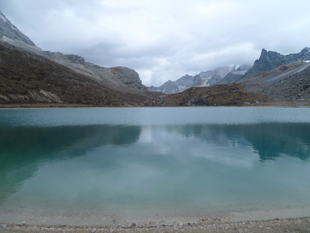 走过一个弯曲的山口眼前顿时豁然开朗了起来,有种陶渊明笔下的感觉啊!当然此处没有桃花,也没有村庄人家,唯有牛奶海平静地躺在央迈勇脚下。