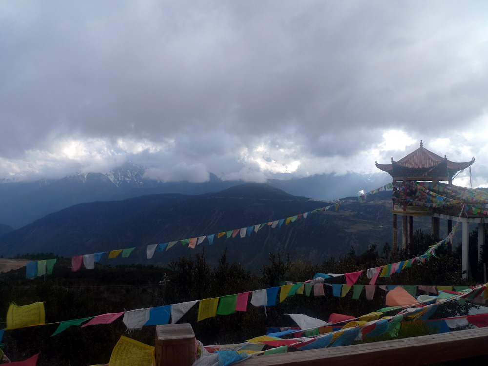 冲古寺门口的经幡与左上方隐约可见的仙乃日