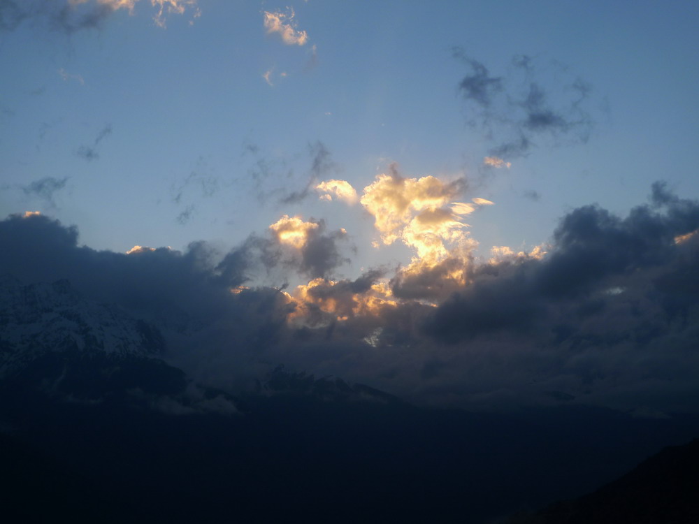 前一天在旅店附近散步的时候遇见一位很年轻的地主介绍我们早起去一个垭口下的寺庙可以看到日出,早起之后发现天气不好,云雾缭绕因此日出铁定是无望了。