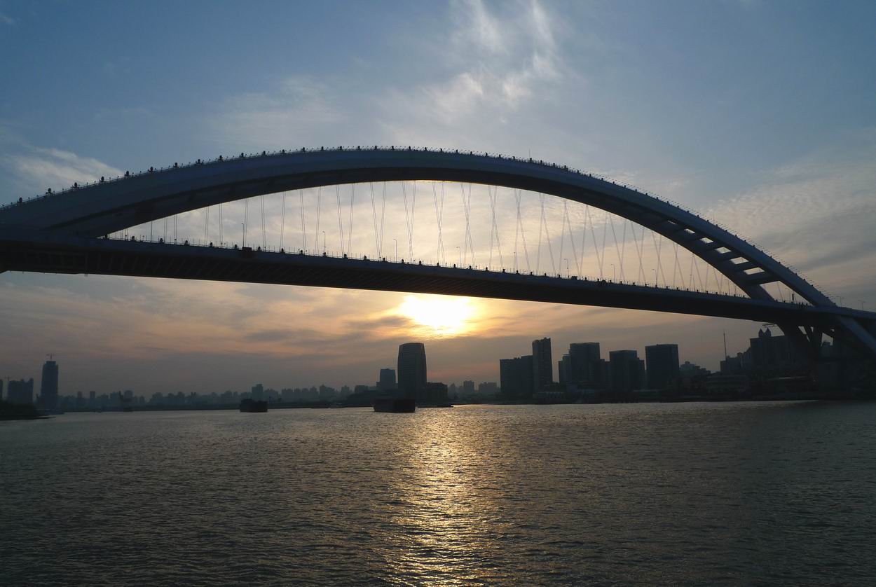 回去的水路正好是夕阳之时,我算是体会到什么是“暮然回首”了,快靠岸的时候回头,余晖下的卢浦大桥,还是很美的: